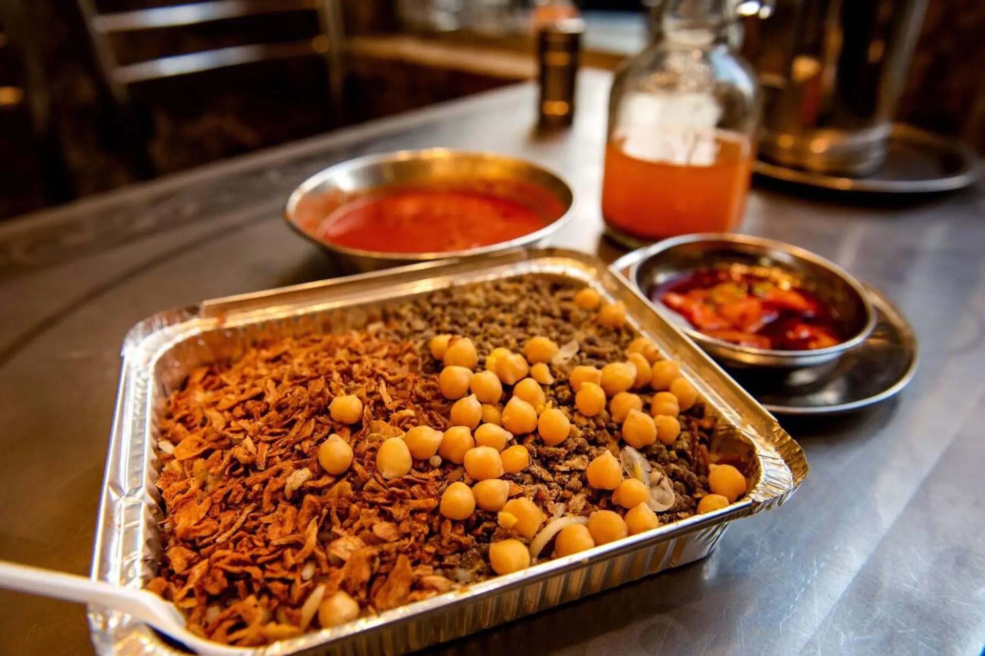 Il piatto nazionale dell’Egitto: strati di riso, maccheroni e lenticchie, conditi con salsa di pomodoro, cipolle croccanti e ceci.