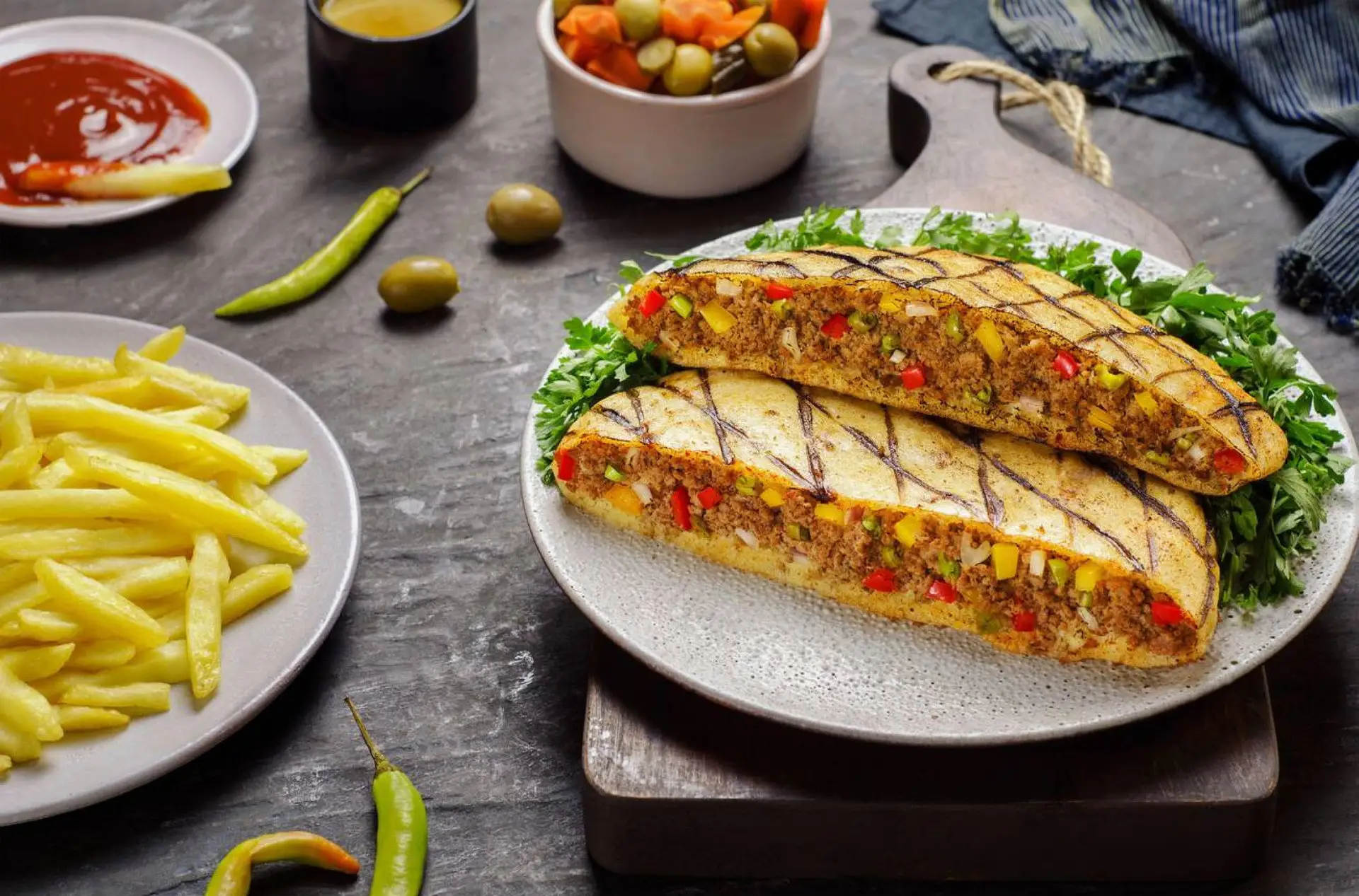 Carne marinata (manzo o pollo) tagliata a strisce sottili e avvolta nel pane.
